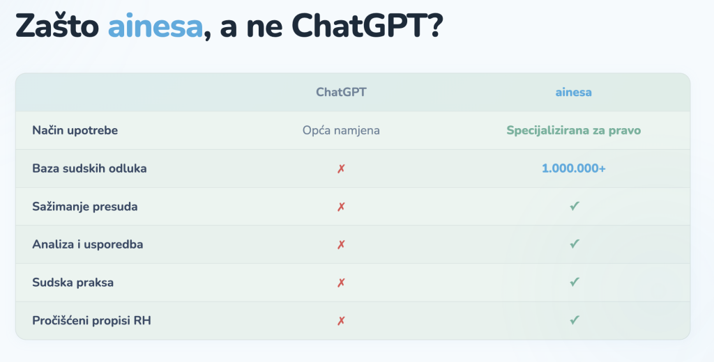 Često se susrećemo s tvrdnjama potencijalnih korisnika kako već plaćaju i koriste umjetnu inteligenciju poput ChatGPT-a, te im na prvu nije posve jasno zašto bi im trebao još jedan alat. Mnogi zapravo nisu svjesni prednosti koje donose rješenja specijaliziranih AI alata poput Ainese Nove dok se osobno ne uvjere u sve njihove funkcionalnosti. Iako su sustavi opće namjene izuzetno korisni za svakodnevne zadatke poput pisanja e-mailova, kreiranja tekstova ili općeg informiranja, rješavanje složenih problema u visoko reguliranim branšama poput prava zahtijeva potpuno drugačiji pristup.